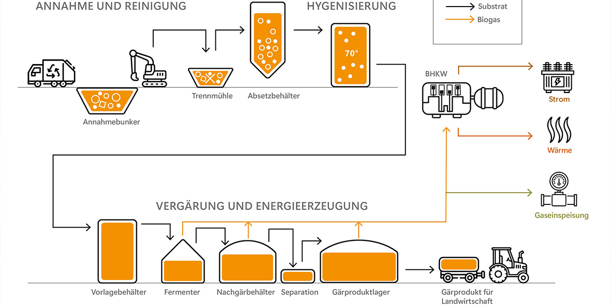 Bei der Abfallvergärung nutzt man die hohen Energiereserven im Bioabfall, um nachhaltig sauberen Strom und Wärme zu produzieren. Das schont die Umwelt und setzt vorhandene Ressourcen wirkungsvoll ein.