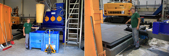 In der Aufbereitungshalle werden anorganische Abfälle aussortiert. Die Laster kippen den Abfall in einen 75 Kubikmeter fassenden Tiefbunker (oben links). Dort erfolgt eine erste Sichtung des Substrats. Übergroße Teile wie Paletten werden entfernt. Ein Bagger hebt das Substrat dann in einen Hochbunker (oben rechts). Darin zerkleinert eine Trennmühle das Substrat und reichert es mit Flüssigkeit an. Ein Sieb mit zehn Millimeter großen Spaltbreiten trennt grobe Störstoffe vom Rest des Substrats. Das Substrat gelangt in einen weiteren, 60 Kubikmeter großen Tiefbunker (unten rechts). Von dort fließt es über eine Rohrleitung von der Aufbereitungs- in die Hygienisierungshalle.